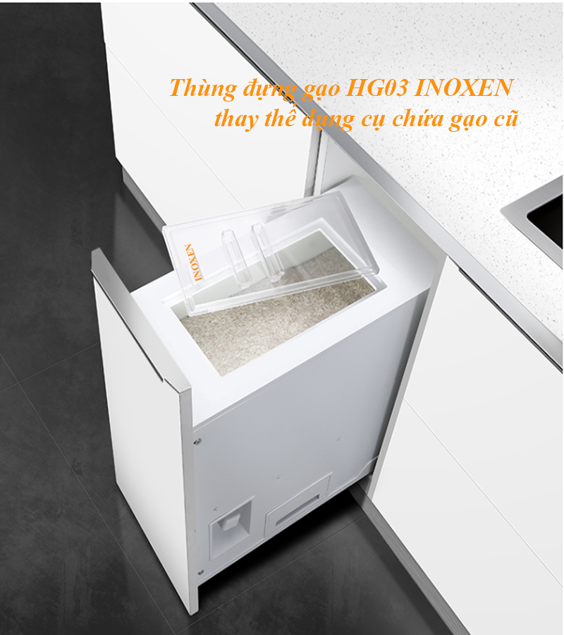 Hũ, bình đựng gạo đã biến mất thay vào đó là thùng đựng gạo thông minh âm tủ HG03 INOXEN