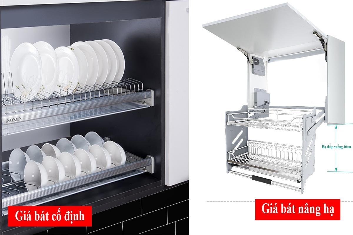 Các phụ kiện tủ bếp trên thường thấy là giá để bát đĩa cố định và giá để bát di động (nâng hạ).