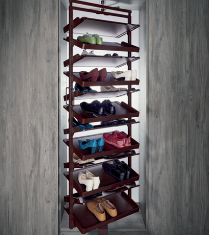 Phụ kiện thông minh tủ áo không thể không nhắc đến giá xoay để giày. Nó giúp bạn tiết kiệm tối đa không gian lưu trữ bên ngăn tủ đựng giày và bạn dễ dàng kiểm soát tất cả những đôi giày dép mình đang có.