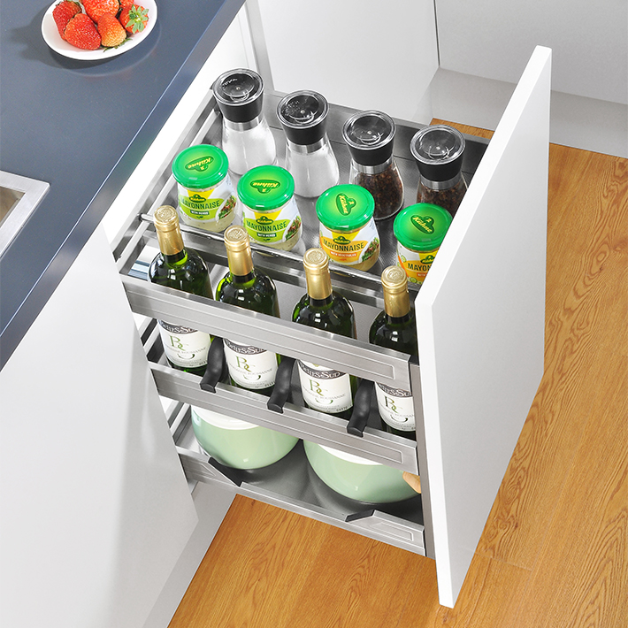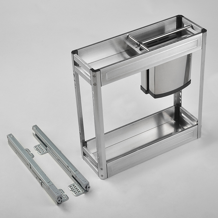 Cơ cấu hoạt động độc lập trên hệ thống ray trượt, mỗi lần bạn sử dụng toàn bộ giá dao thớt gia vị đa năng sẽ trượt toàn phần ra khỏi hộc tủ. Việc cất lấy dụng cụ, chai lọ một cách dễ dàng và thuận tiện. Bằng động tác đẩy nhẹ mà không tốn sức lực nào giá kệ inox cài dao thớt lại trượt về vị trí bạn đầu trong hôc tủ, không hề tạo nên tiếng ồn. Mọi thứ được giấu kín gọn gàng và âm tủ. Tạo nên một không gian thoáng đãng, tiết kiệm diện tích tối đa cho căn bếp.