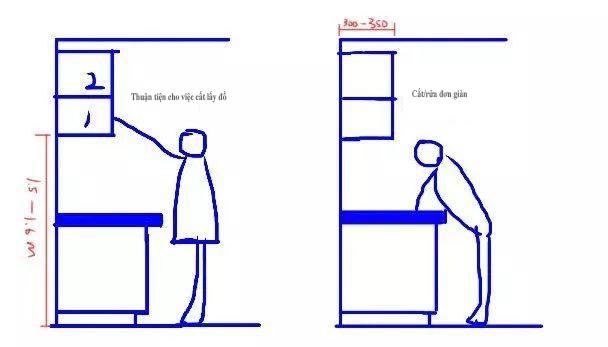 Tủ bếp âm tường cần được xác định theo chiều cao của tủ sàn bếp và đối tượng sử dụng, cần chú ý hai vấn đề: một là độ sâu của tủ âm tường, để tránh vô tình va vào nhau. Thứ hai là chiều sâu và chiều cao của tủ bếp, nếu không những thứ trên tủ treo sẽ nằm ngoài tầm với.
