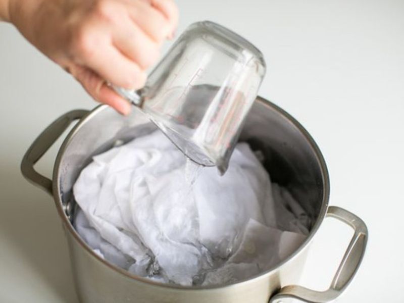 Đây được coi là giải pháp an toàn và phổ biến giúp loại bỏ dầu mỡ, bụi bẩn. Bạn nấu một nồi nước sôi, thả khăn, giẻ rửa bát vào. Cho thêm nước tẩy rửa và ngâm đến khi nước hạ nhiệt và không còn nóng, giặt sạch lại rồi phơi khô ráo. Cách làm như vậy giúp loại bỏ vi khuẩn trên giẻ nhanh và tiện nhất.
