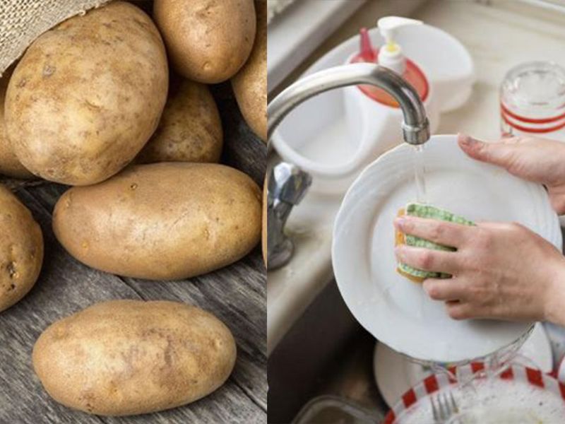 Các dụng cụ nhà bếp như bát đũa chưa rửa sạch thường sẽ để lại nhiều mảng bám dầu mỡ. Lúc này vỏ khoai tây sẽ phát huy tác dụng. Phần nước được luộc từ vỏ khoai tây và củ khoai tây sẽ khiến cho những vết dầu mỡ mềm đi và dần tan vào với nước. Việc bạn cần làm là đun nước từ vỏ khoai tây hoặc củ khoai tây và nhúng bát đĩa vào trong khoảng từ 15 tới 20 phút. Việc tiếp theo là đợi chờ vết dầu mỡ không còn bám vào bát đĩa hay dụng cụ nhà bếp. Cuối cùng lấy nước rửa chén để rửa lại thật sạch là xong.